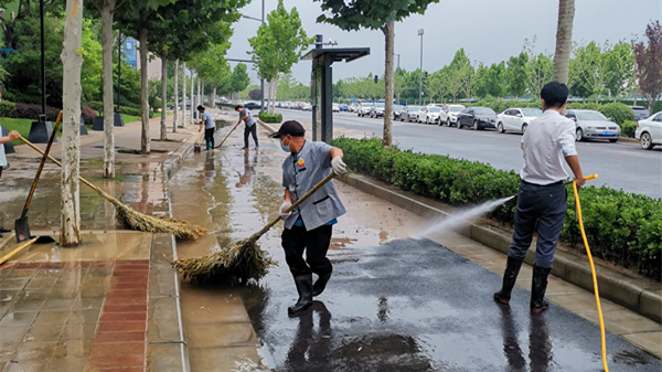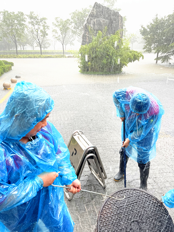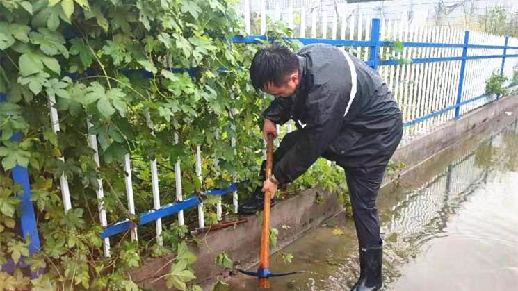 ▲工作人員及時(shí)疏通地面、屋面排水溝