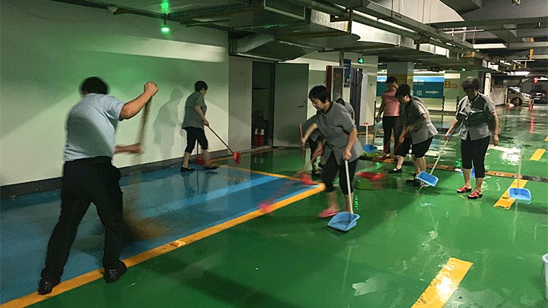 在雨水絲毫不減,越下越急的危機(jī)時(shí)刻,工程部師傅們毅然踏入水中,一點(diǎn)一點(diǎn)清理被堵的排水口,盡全力保障業(yè)主家園安全。平均年齡比其他各部門(mén)都高的環(huán)境部工作人員,絲毫沒(méi)拖任何后腿,全力向前,爭(zhēng)分奪秒地不間斷補(bǔ)位吸水排污,順利完成美盛中心地下三層車(chē)庫(kù)無(wú)積水出現(xiàn)任務(wù)。
